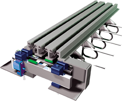 MZL系列型鋼伸縮裝置是基于動(dòng)力學(xué)抗疲勞原理而設(shè)計(jì),由多個(gè)支承單元組成彈性支承系統(tǒng),各位移彈簧將支承單元串聯(lián)起來(lái)形成位移控制系統(tǒng)。