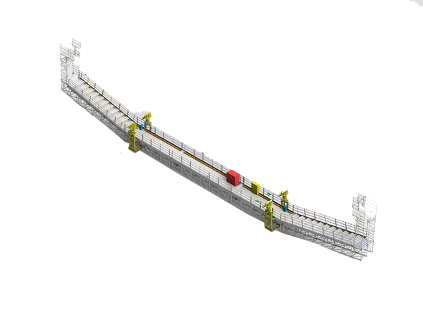 主拱檢修車(chē)安裝于拱肋的軌道上,沿著拱肋行走,采用齒條或鏈條形式電動(dòng)爬軌,檢修車(chē)配備有吊籃系統(tǒng),可對(duì)拱立面、底面、吊桿、橫梁等進(jìn)行檢修維護(hù)。具有軌距自適應(yīng)、工作平臺(tái)自調(diào)平、三重制動(dòng)安全保護(hù)和防墜、防滑安全保護(hù)等特點(diǎn),舒適度高。